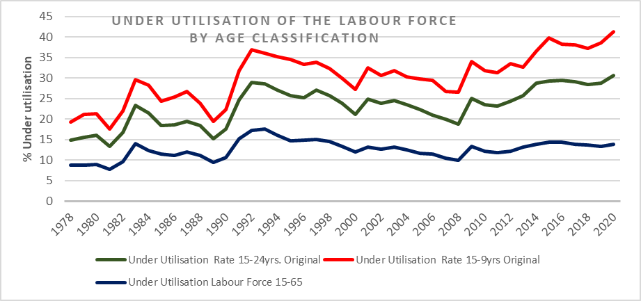 - Blue Curve: labour force underutilisation rate 15-65 years