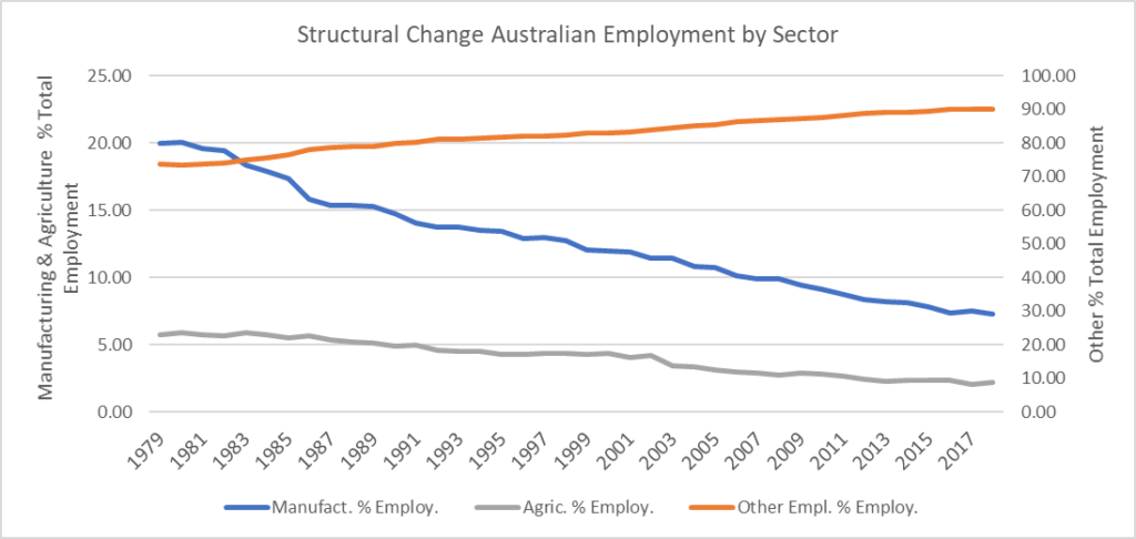 Changes to the industrial base must indirectly impact upon economic growth. Whilst the contribution to economic growth from manufacturing and agriculture is calculated on a value-added output basis, service industries contribution is calculated by wage or income increments. Herein lies a dilemma for central bank inflation targeting. The key policy target in the services sector, wage growth, becomes compromised with respect to growth.